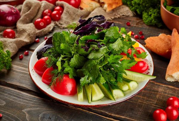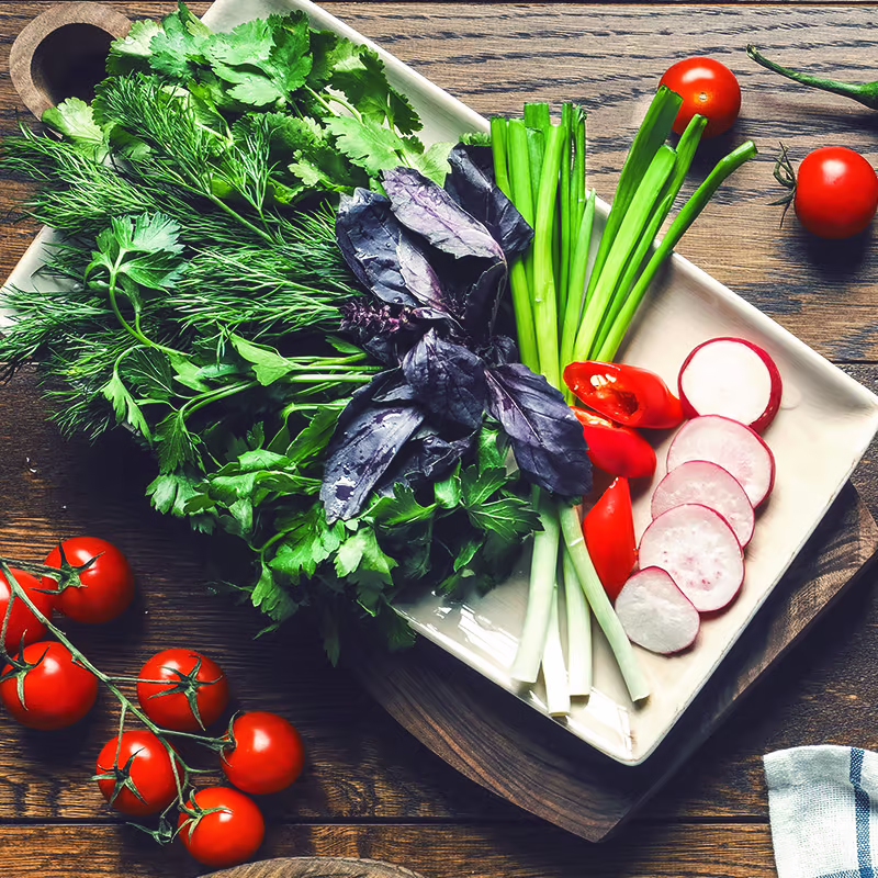 Огурцы, помидоры, болгарский перец, острый перец, редис, ассорти из зелени