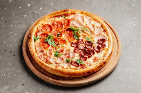 Пепперони, ветчина, бекон, свинина, говядина, моцарелла, фирменный соус